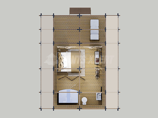 La taille globale de la tente safari est d'environ 40 m², avec un grand balcon de 16 m². L'espace intérieur est de 24 m², qui peut être décoré selon vos idées de glamping. Utilisez pleinement le balcon et l'intérieur, placez le canapé et la table à manger sur le balcon et divisez l'intérieur en chambre, cuisine et salle de bain. La disposition efficace peut faire en sorte que vos invités aient toujours tout l'espace dont ils ont besoin.